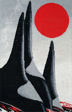 The finished canvas measures 15" x 22.5" and has been designed using Paternayan tapestry wool. The background is a range of whites, leading to grey. The orcas are stitched in a rich range of greys, combined with black. To imitate the spray, lighter colors have been interspersed; tiny beads (included) are then stitched over selected light stitches, giving a sense of the moisture in the air.