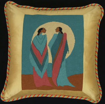 Sisters can also be a cushion, if done on 12 count canvas. The finished canvas size is 13.4" x 17.4" and we recommend Zweigart penelope canvas, 12 holes per inch, also known as 12 count, 17.5" x 21.5". The pattern sells for $20.00 Cdn and the kit sells for $149.00.